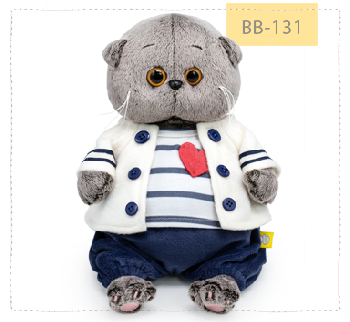 Малыш Басик в стильном морском костюмчике. Курточка из белого флиса с синими пуговками и отделкой по рукавам синей тесьмой. Майка из белого х/б трикотажа в серо-синюю тонкую полоску, маечку украшает красное сердечко из фетра. В комплекте также уютные штанишки из темно-синего софта.