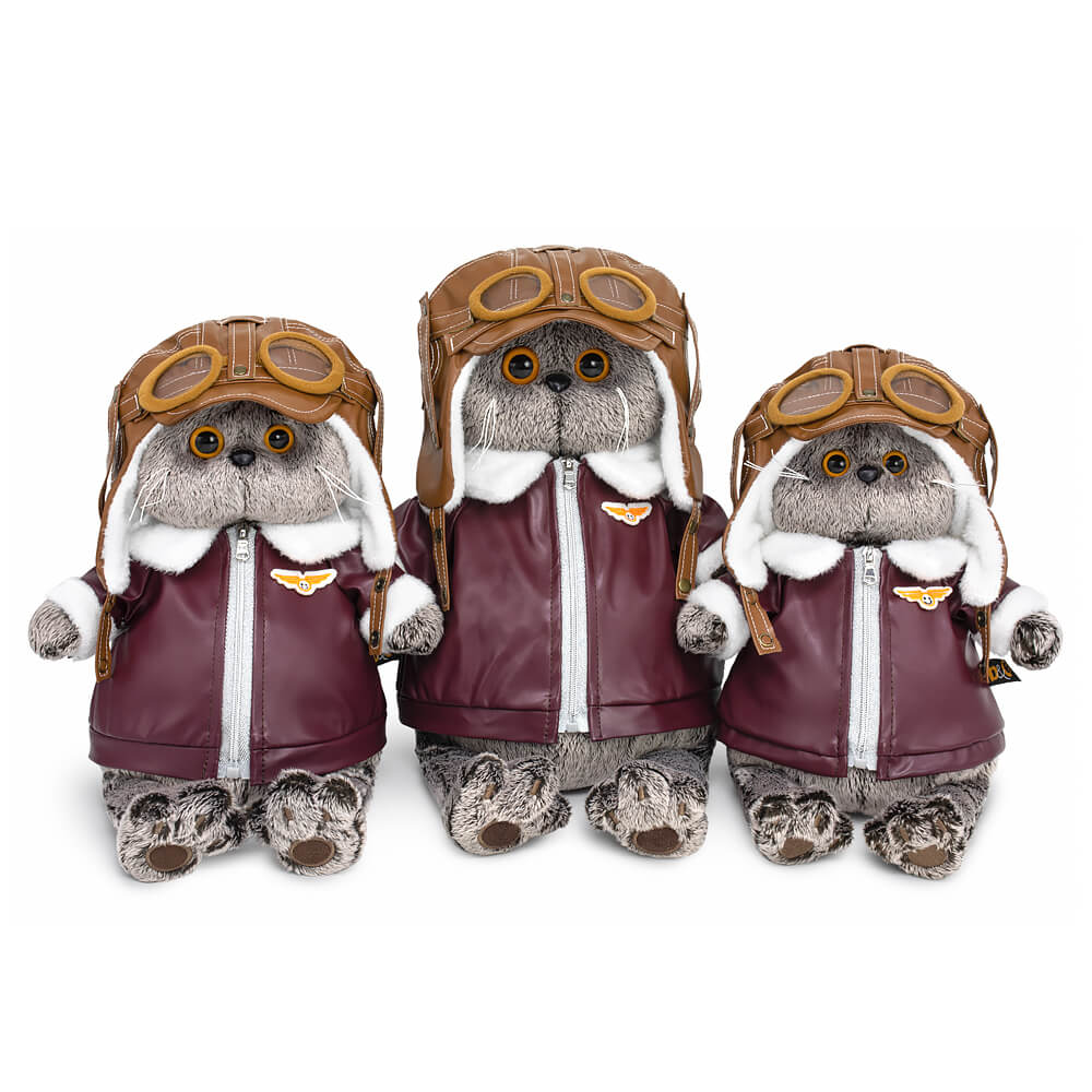 Кот Басик в суперстильном лётном костюме. На коте лётная куртка из эко-кожи цвета Бургундия. Куртка сшита на широкой опушке по низу, с отложным воротником и манжетами из короткого белоснежного меха, с застёжкой спереди на серебристую молнию. Спереди куртку украшает нашивка в виде крыльев. Также на Басике крутой лётный шлем, сшитый из эко-кожи карамельного цвета с подкладом из белого меха. Шлем отделан контрастной строчкой и ремешками с латунными клёпками. На шлем прикреплены специальные лётные очки с оторочкой из эко-замши песочного цвета.