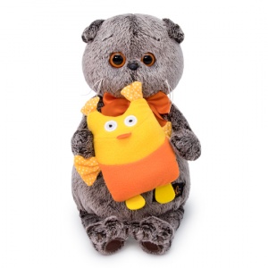Басик держит в лапках забавную игрушку – жёлтенькую сову, сшитую из флиса. Также на Басике оранжевый галстук бабочка.