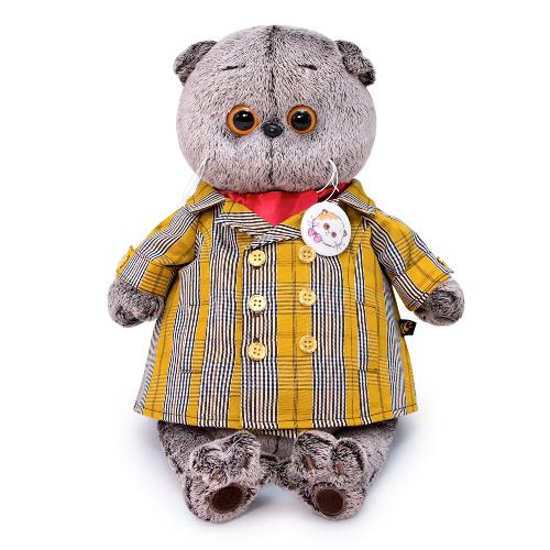 Басик в шикарном двубортном охристом плаще в невероятно модную в этом сезоне клеточку. Плащ с золотыми пуговками, патами на рукавах также с золотыми пуговками и карманами-листочками. В комплекте шелковистый алый шейный шарфик и значок на лацкане с портретом любимой подружки Лилички.