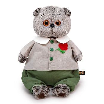Басик в очень милом костюмчике. Рубашка красивого сложного оттенка с отложным белоснежным воротничком, на зеленых пуговках спереди. Украшена вышитым алым цветком. Также на Басике широкие х/б штанишки плотного елового цвета.