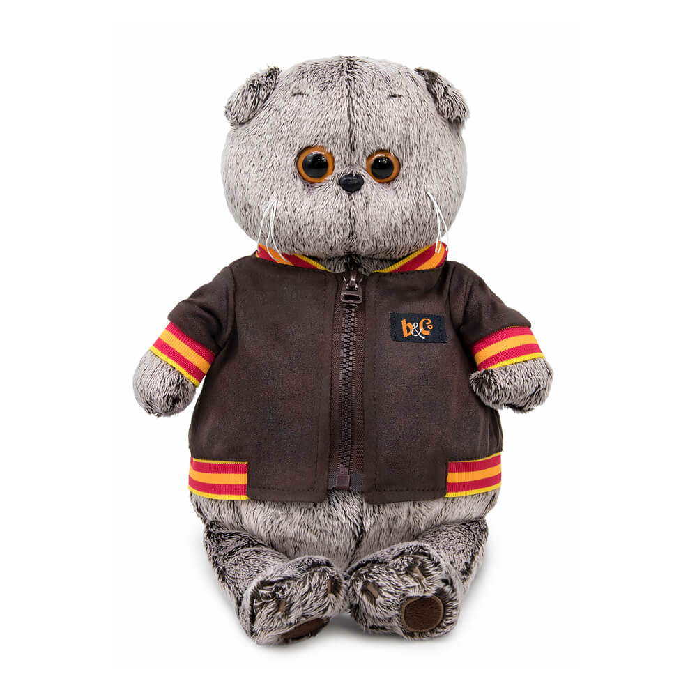 Кот Басик в супер модном бомбере. Бомбер сшит из мягкой экокожи цвета горького шоколада с необычной текстурой лёгкой потёртости. Воротник и вставки из тканой трикотажной резинки в жёлто-красную полоску. Бомбер застёгивается на тракторную зип молнию в тон куртки.