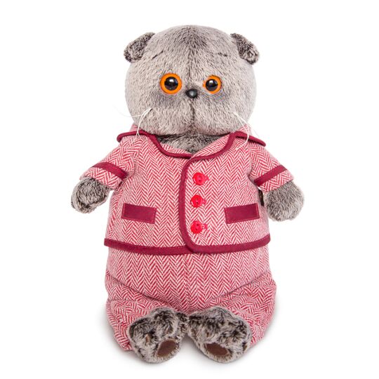 Кот в шикарном твидовом костюме. Пиджак и брючки сшиты из мягкого твида в ёлочку цвета красной герани. Пиджак оформлен кантом из смесовой ткани гранатового цвета. Застёгивается пиджак на гладкие малиново-красные пуговки.