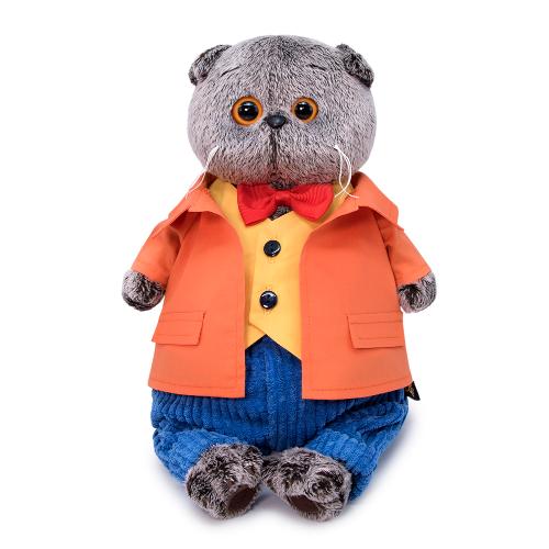 Басик в ярком комплекте. Оранжевый пиджак, сшитый из плотной костюмной ткани, желтый жилет на черный пуговках, ярко‑синие штаны из крупного вельвета. Завершает комплект алый галстук‑бабочка из сутажной ленты.