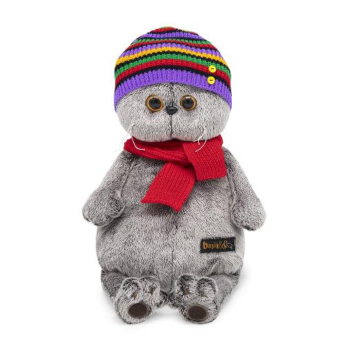 На Басике вязаный комплект сочных оттенков. Яркая шапочка в разноцветную полоску, украшенная двумя лимонными пуговками. Также в комплекте уютный шарфик с зауженными концами.