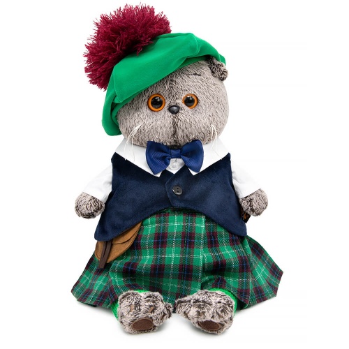 Кот Басик в национальном шотландском костюме. На коте юбка-килт в клетку тартан в зелёных оттенках, на килте спереди расположена поясная сумочка-кошель – sporran, выполненная из экозамши и украшенная тёмно-коричневой кожаной кисточкой. Также на Басике бархатный жилет тёмно-синего цвета, белоснежная хлопковая рубашка с тёмно-синим галстуком-бабочкой. На голове Басика объёмный берет из бархатистого софта благородного зелёного цвета с бордовым помпоном. На лапках зелёные гетры из трикотажа.