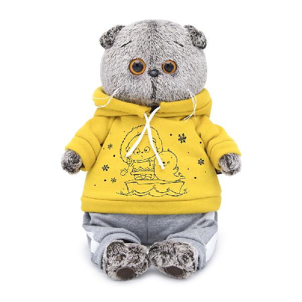 Басик в уютном спортивном костюмчике. Модный свитшот с капюшоном цвета одуванчика из х/б футера с оригинальным принтом «Басик на севере» и штанишки из дымчатого футера с белыми лампасами.