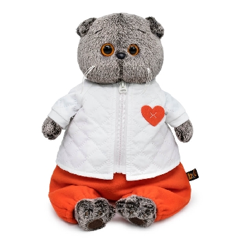 Кот Басик в невероятно стильном комплекте. Белоснежная курточка на молнии, сшитая из болоньи со стёганным эффектом. Курточку украшает милое оранжевое сердечко из фетра. В комплекте уютный ярко-оранжевый комбинезон из мягкого флиса, сшитый на лямочках с пуговками и резиночками по низу штанин.