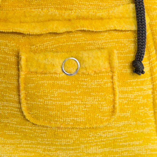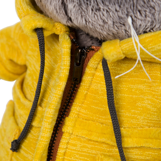На Басике очень уютная курточка цвета золотой осины, сшитая из меланжевого флиса с начёсом. Модная курточка с капюшоном и кармашками, со швами наружу, с металлическими кнопками, с застёжкой на молнию и шнурками на капюшоне.