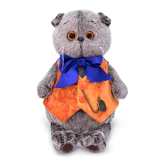 Кот в элегантном, бархатном жилете на пуговках. Спинка жилета сшита из сатина насыщенного лазурного цвета. В комплекте — карманные часы на цепочке и объемный бант на шее из широкой атласной ленты морского синего цвета.