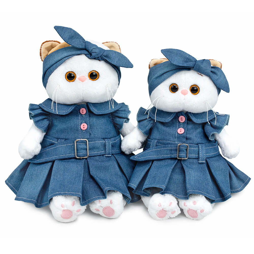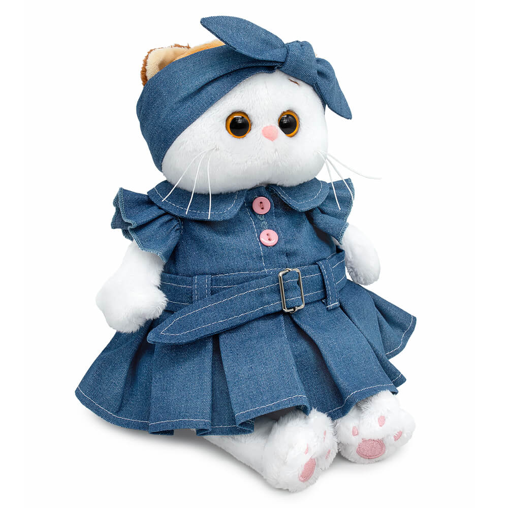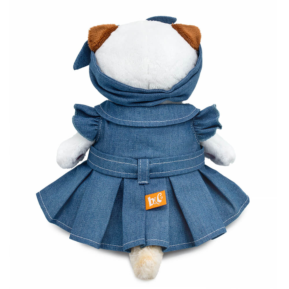 Кошечка Ли-Ли в модном платье из денима синего цвета с серым оттенком. Платье сложного кроя, отрезное по талии, с застёжкой на розовые пуговки, закруглённым воротничком, крылышками и пышной юбкой. Платье сшито с пояском с серебристой пряжкой, продетым в шлёвки. Всё платье отделано контрастной строчкой. На голове у Ли-Ли милый аксессуар в виде ободка-платочка.