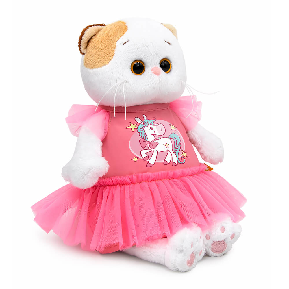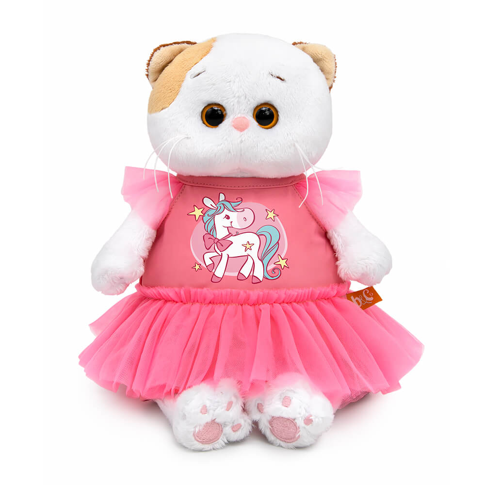 На кошечке Ли-Ли очаровательное платье в розовых оттенках. Верх платья сшит из х/б трикотажа, юбочка из тончайшей сеточки в несколько слоёв, рукава-крылышки также из сеточки. Спереди на платье термонаклейка с авторским рисунком в виде милой лошадки, символом года 2026.