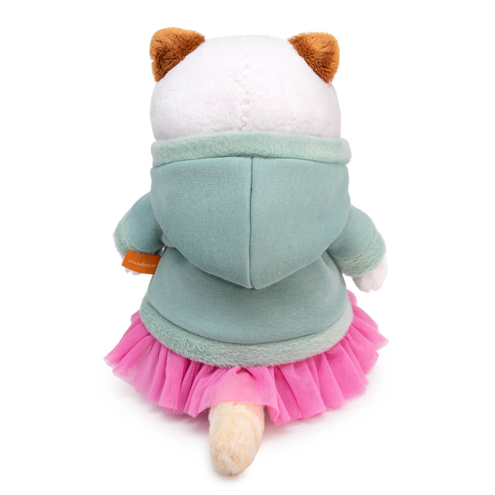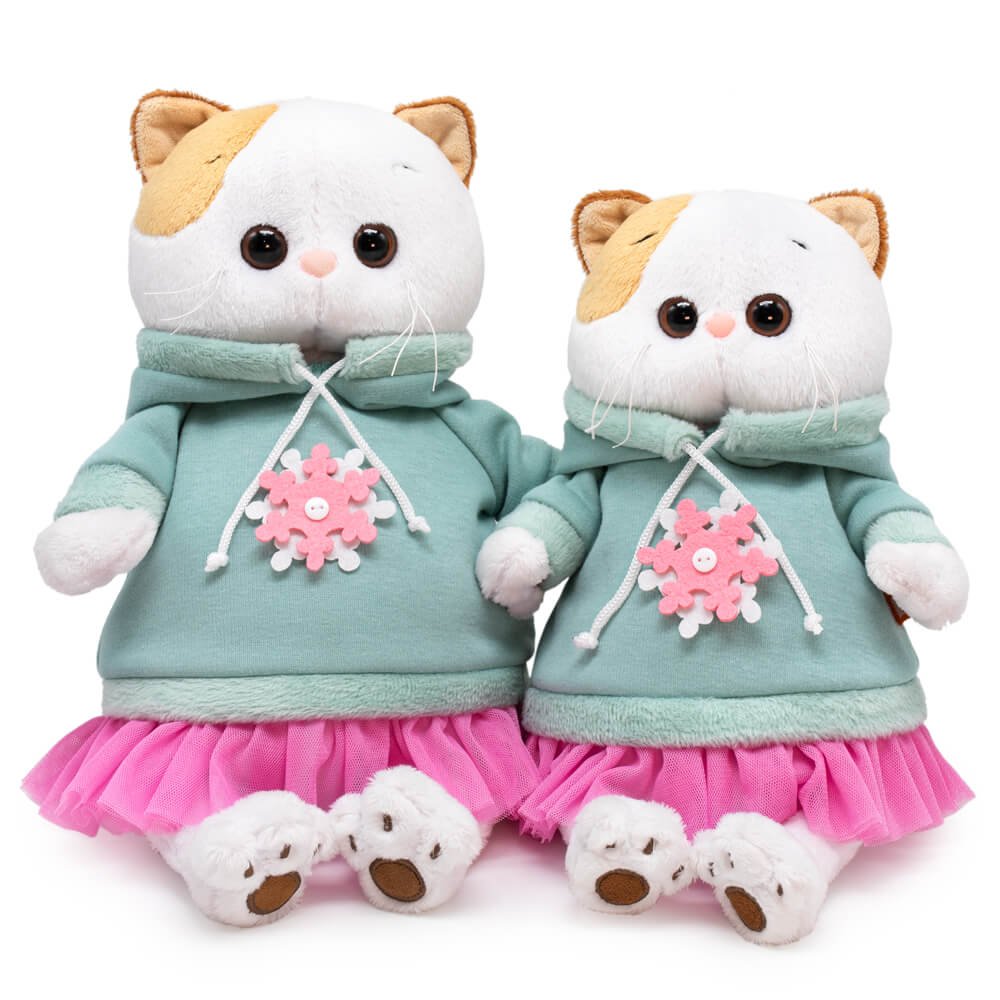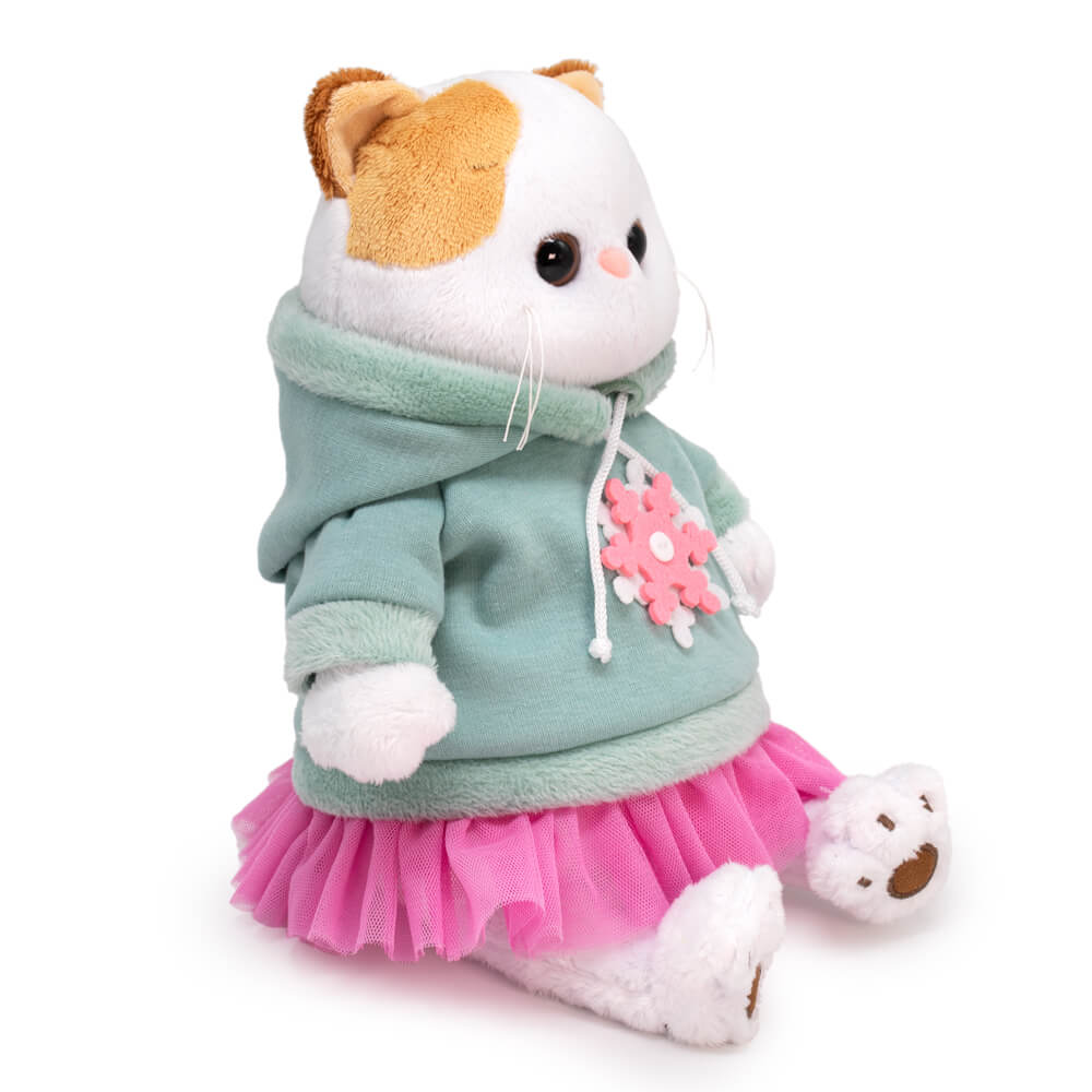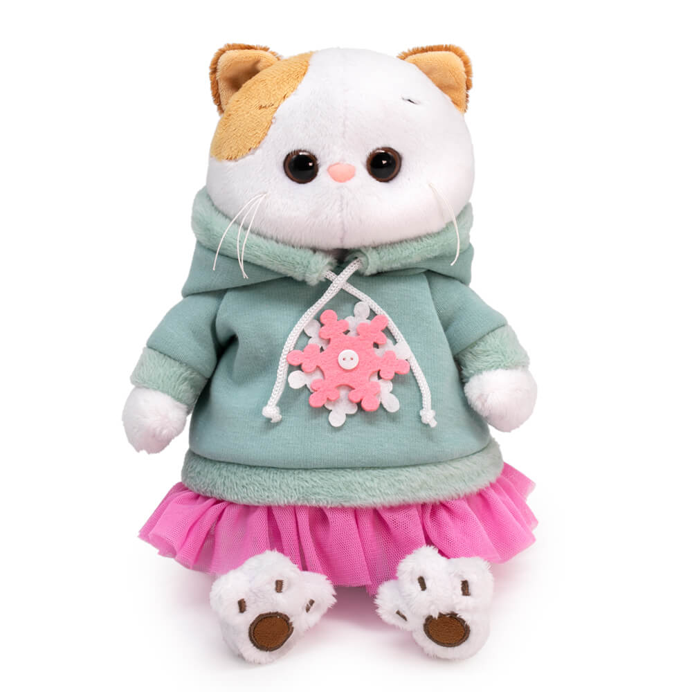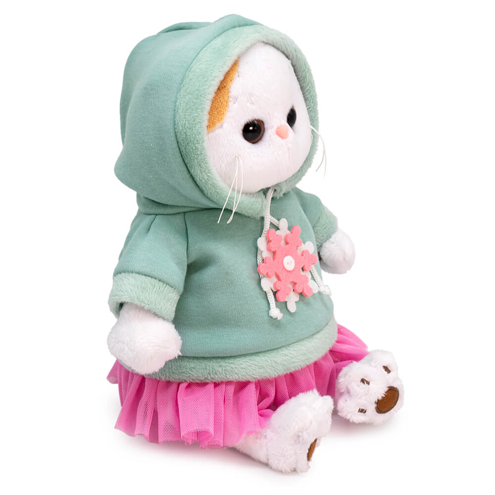На Ли-Ли очень крутой свитшот из мягкого футера цвета полыни. Свитшот сшит с капюшоном, рукавом реглан, украшен красивой бело-розовой снежинкой и оборочкой из легкой сеточки цвета розовой азалии.