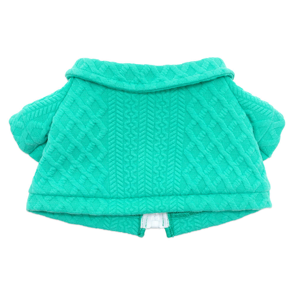 Теплая курточка, из ткани с имитацией вязки чистого бирюзового оттенка. Курточка спереди застегивается на белую тракторную молнию. Также на курточке симпатичный аксессуар в виде сердечка из глиттерного материала.