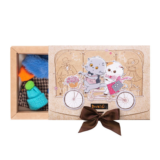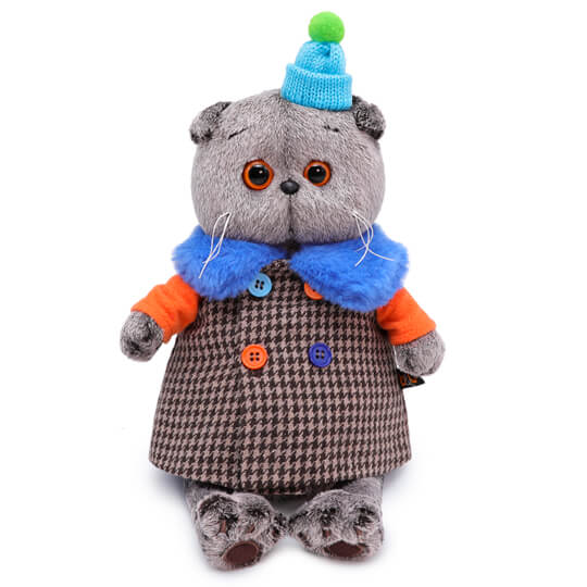 Забавное комбинированное пальто для Басика, с ярко-оранжевыми рукавами, ярко-голубым меховым воротником и разными по цвету пуговками. В комплекте маленькая вязаная голубенькая шапочка с маленьким помпоном.