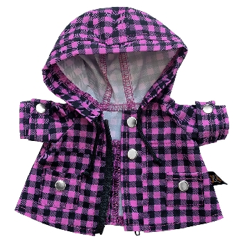 Шикарный демисезонный плащ для Басика в графитово‑сиреневую клеточку виши. Плащ сшит с капюшоном с затяжкой на черный шнурок, с накладными кармашками и шлевками на рукавах. Застегивается плащ на черную молнию, которую закрывает планка с серебристыми кнопками.