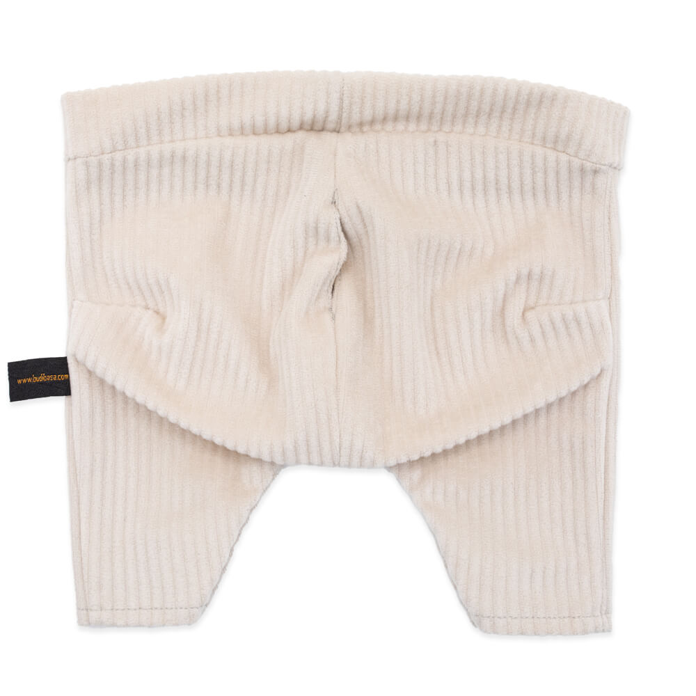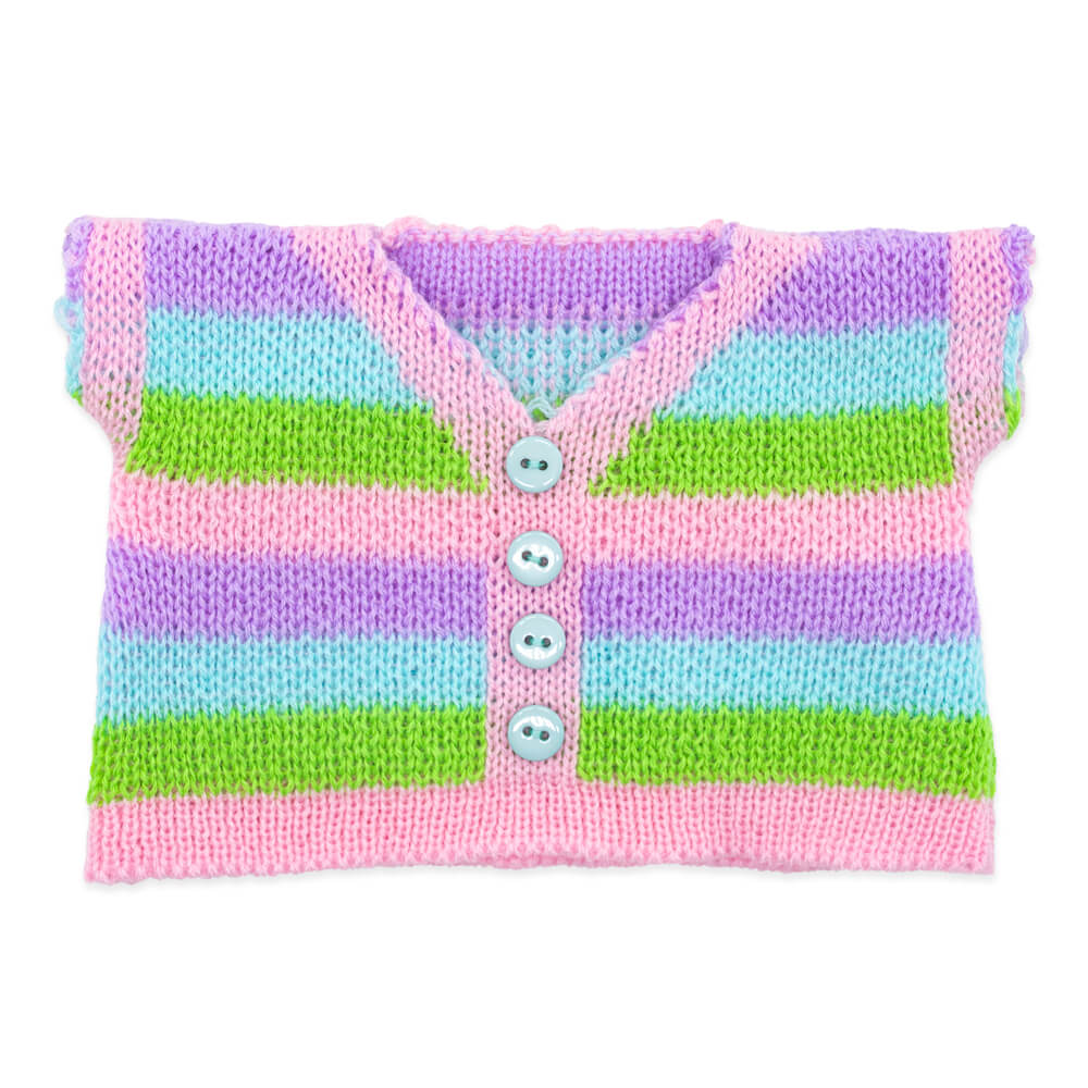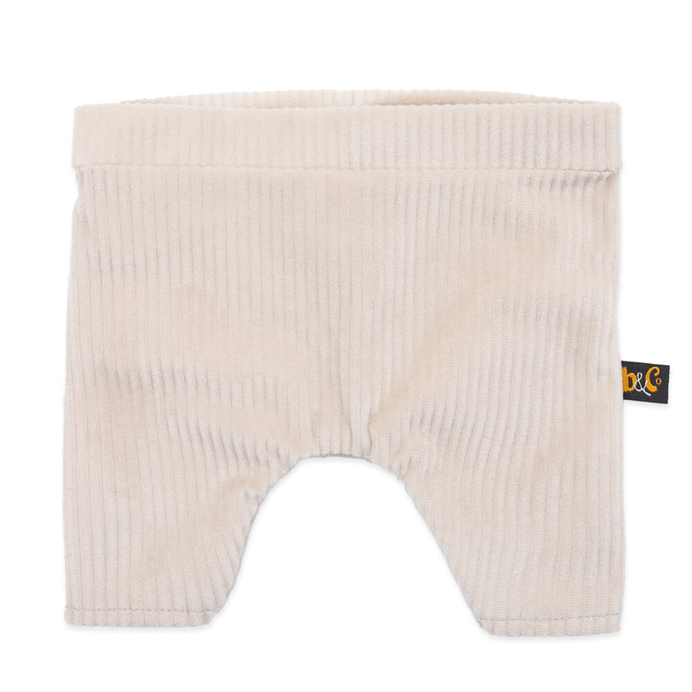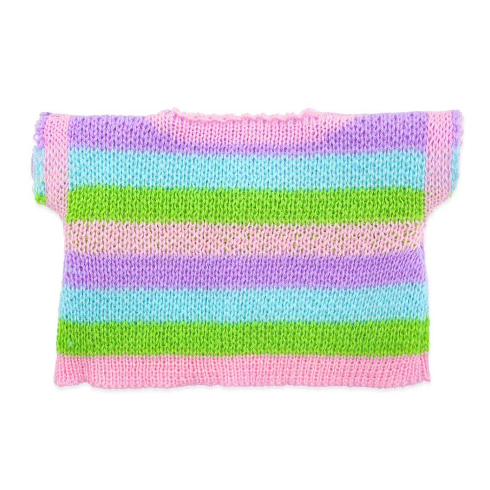 Полосатый свитер необычного дизайна, связанный в виде кофты на пуговках. Уютные штанишки из мягкого вельвета цвета экрю. И завершает комплект шейный х/б платочек нежно‑голубого цвета в мелкий белый горошек.