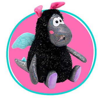 Забавный дракончик Товви сшит из тканей-компаньонов — антрацитового меха с серебристым блеском, плотного трикотажа с переливающимся напылением и нежного софта разных цветов.