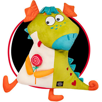 Очень забавный дракончик Трюгги сшит в виде подушки из софта ярких цветов, отлично гармонирующих между собой. В лапках у Трюгги круглая карамелька на палочке.