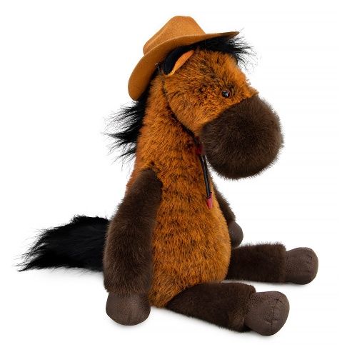 Невероятно красивый конь Герард сшит из очень необычного меха, рыжего с тёмным подпалом. Грива и хвост из смолисто-чёрного прямого меха. Морда, передние и задние ноги из короткого меха шоколадного цвета, копыта из коричневой экокожи. Ушки коня из чёрного и рыжего софта. Конь Герард в классной ковбойской шляпе на кручёном чёрном шнурке-боло (Bolo tie) с бордовым зажимом и пластиковыми наконечниками.