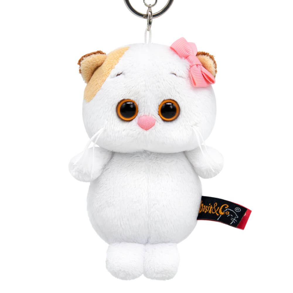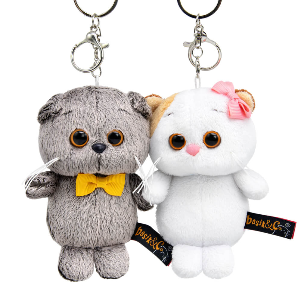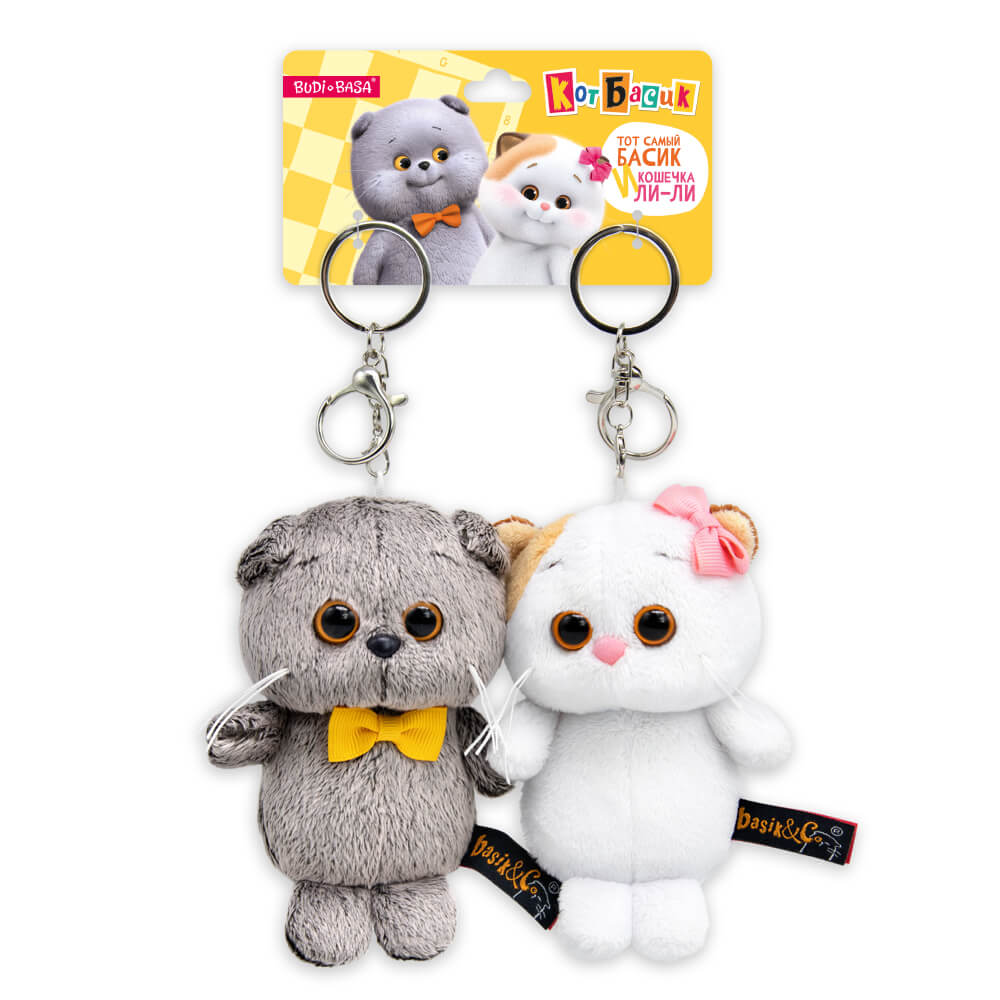 Оригинальный комплект брелоков с котом Басиком и кошечкой Ли-Ли. У друзей в щёчках есть маленькие магнитные вставки, что позволяет им притягиваться друг к другу при встрече. На Басике небольшой золотисто-охристый бантик из сутажной ленты. На ушке Ли-Ли розовый бантик. У каждого брелка удобный составной карабин с кольцом и застежками. Брелоки расположены на фирменной подложке.