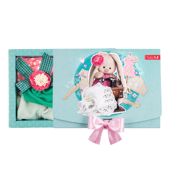 Оригинальный комплект для Зайки Ми. Х/б платье цвета розовой воды в крупный белый горох с мятными пуговками и летнее пальтишко с пояском из нежного софта. Комплект дополняет объёмный изумрудный берет из мягкого флиса с аксессуаром в виде камелии.