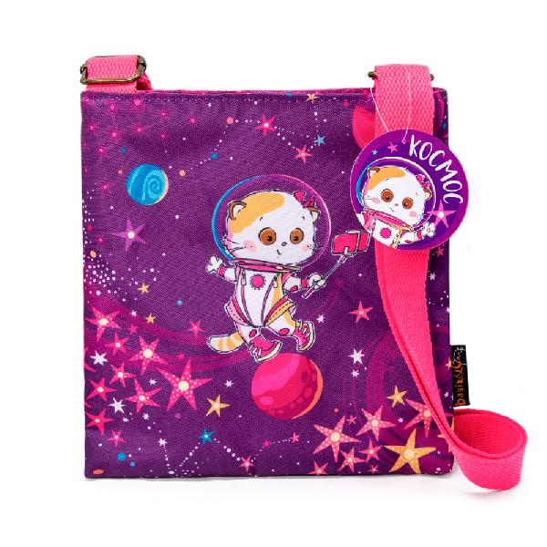 Текстильная сумка кросс-боди с очаровательной Лиличкой в космическом костюмчике, позирующей для фото, среди россыпи звёзд, планет и созвездий. Эффектная палитра принта представлена сливовым, пурпурным, неоново-розовым цветами.