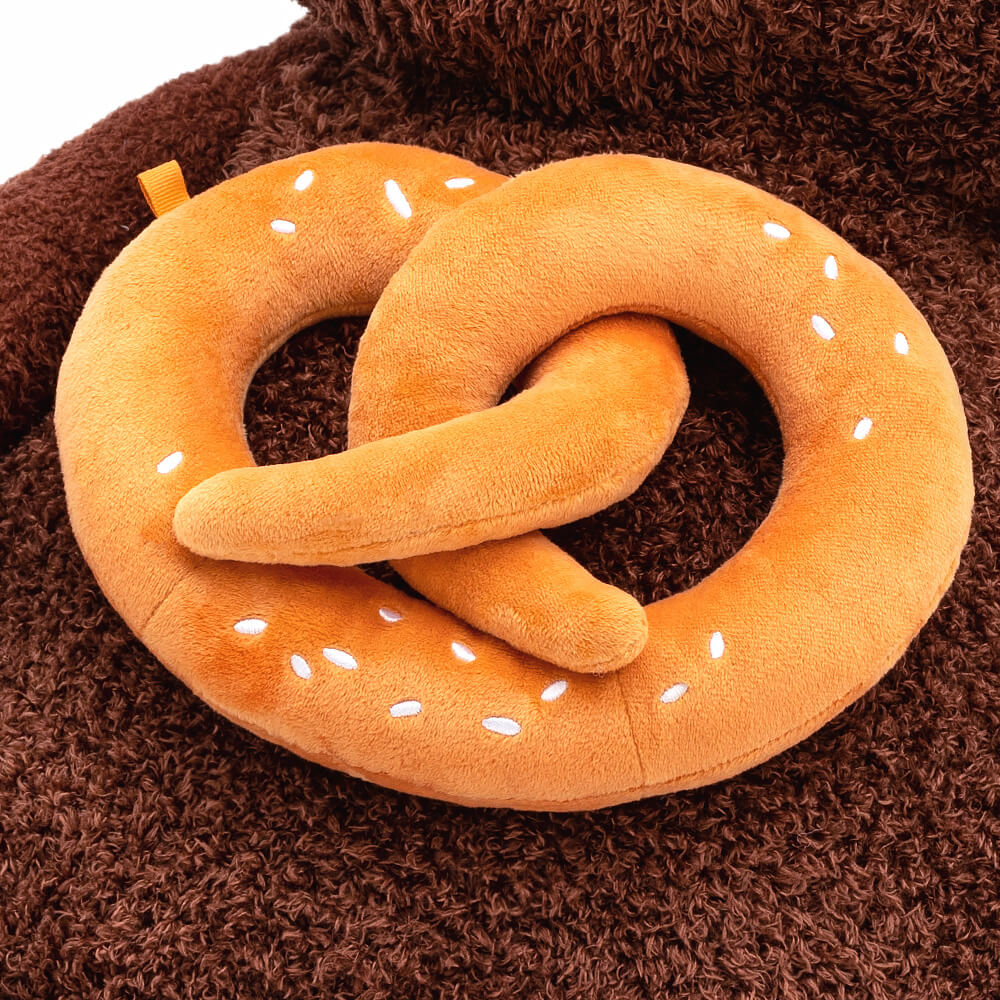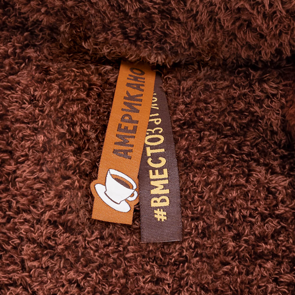 Большой кофейный кот Американо из тактильно приятного экомеха цвета крепкого кофе. Лапы и хвост из более короткого меха. Усы вышиты шелковистыми нитками. Объемный нос обтянут розовым софтом. Выразительные глаза из пластика. Пяточки из шоколадного софта, а внутри ушек софт цвета жженого сахара. Под мордочкой у кота вшиты два лейбла с именем и позитивным хештегом #вместозарядки. Кот очень любит крендель, который всегда с ним. Крендель сшит из софта цвета сдобной выпечки с вышитой посыпкой. На кренделе есть незаметная петелька, за которую его удобно использовать в качестве подвеса.
