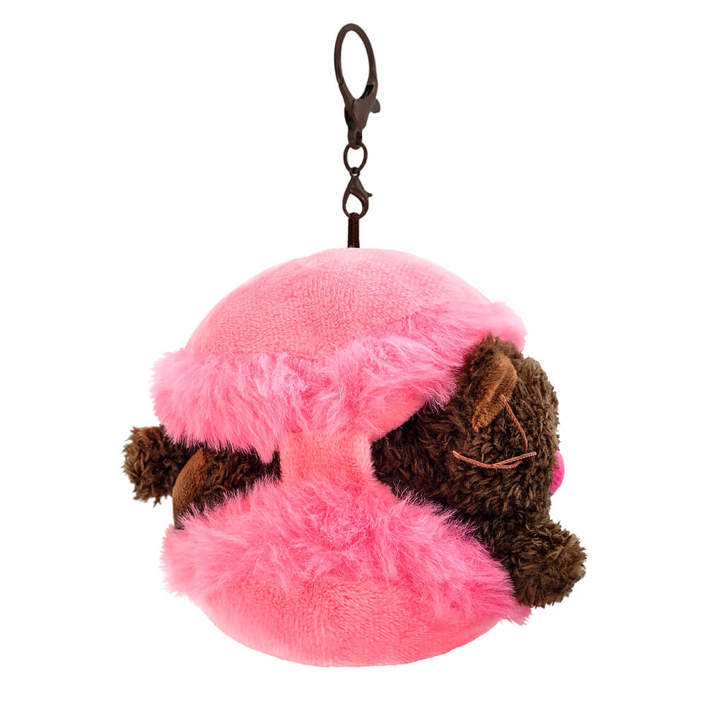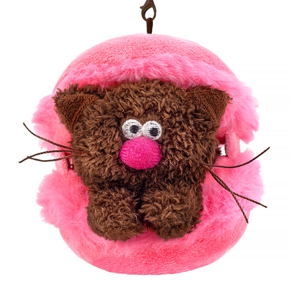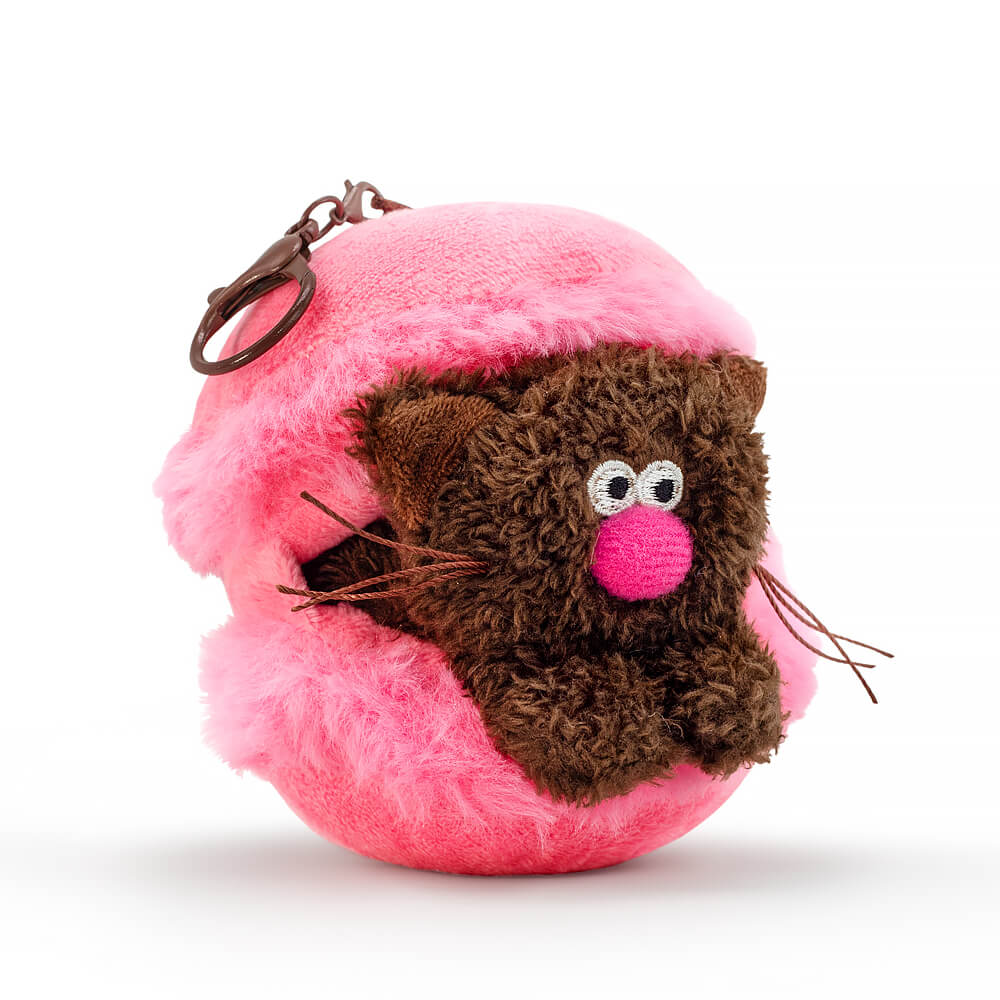 Забавный брелок в виде милого котёнка Эспрессо из тактильно приятного эко меха цвета горького шоколада. Котёнок лежит между половинками пирожного макаронс. Пирожное сшито из нежно-розового софта и короткого меха. У брелока удобный карабин шоколадного цвета с застежками, который можно отстегнуть.