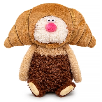 Шикарный кот Капучино из тактильно приятного эко меха в трех оттенках: шоколадного, кремового и молочного цвета. На коте объемная шапочка в виде Круассана. Шапочка сшита из мягкого софта цвета карамели, сверху украшена вышивкой в тон. Шапочка крепится под шеей на липучку.