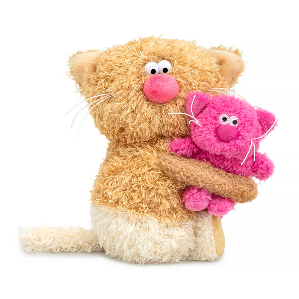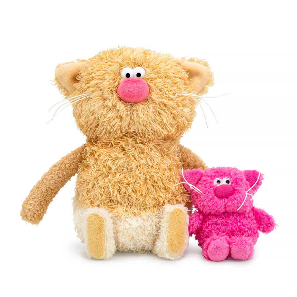 Котик Раф трогательно держит в лапках малыша Вишню, сшитого из ярко-розового эко меха.
