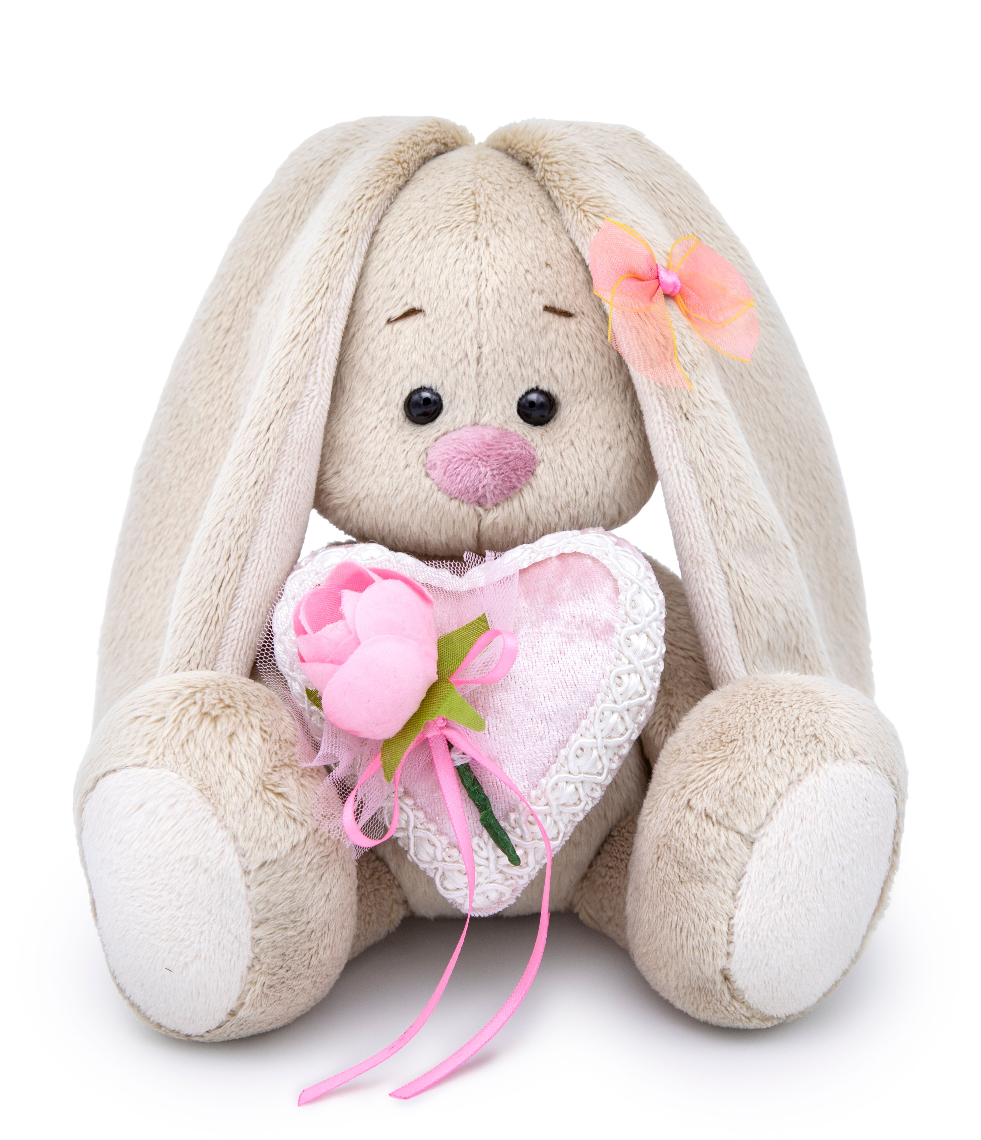 Зайка держит в лапках необычное сердечко. Бледно-розовое сердечко из бархата, отделанное