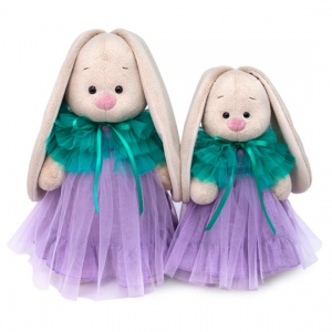 На Зайке необычный наряд — двойное лиловое платье из марлевки и сеточки. Поверх платья объемный воротник-пелерина из нескольких слоев сеточки сочного изумрудного цвета. Пелерина завязывается на атласный бант в тон самой пелерины.