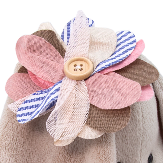 Симпатичное платьице без рукавов, сшитое из х/б ткани в ярко-синюю полоску с белым подъюбником из тонкого хлопка. Спереди платье украшено вертикальной оборочкой. На голове у Зайки цветок, собранный вручную из нескольких видов ткани. В середине цветка пришита деревянная пуговка.