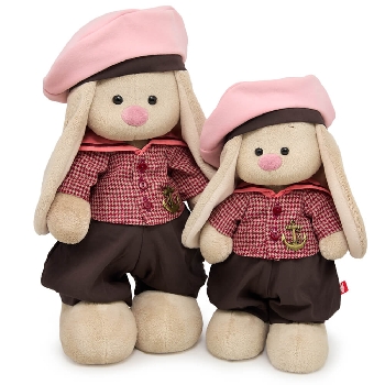 Зайка Ми в милом костюмчике в матросском стиле. Широкие штанишки цвета шоколада. Плотная рубашка со стилизованным большим воротником «гюйс» из хлопка персикового цвета с атласной полоской по краю из ленты кофейного цвета. Спереди рубашка застегивается на пуговки в тон. Полочка рубашки украшена аксессуаром в виде металлического под бронзу якоря. Также в комплекте объемная бескозырка жемчужно-розового цвета, сшитая из мягкого флиса с коричневым ободком и двумя атласными лентами сзади.