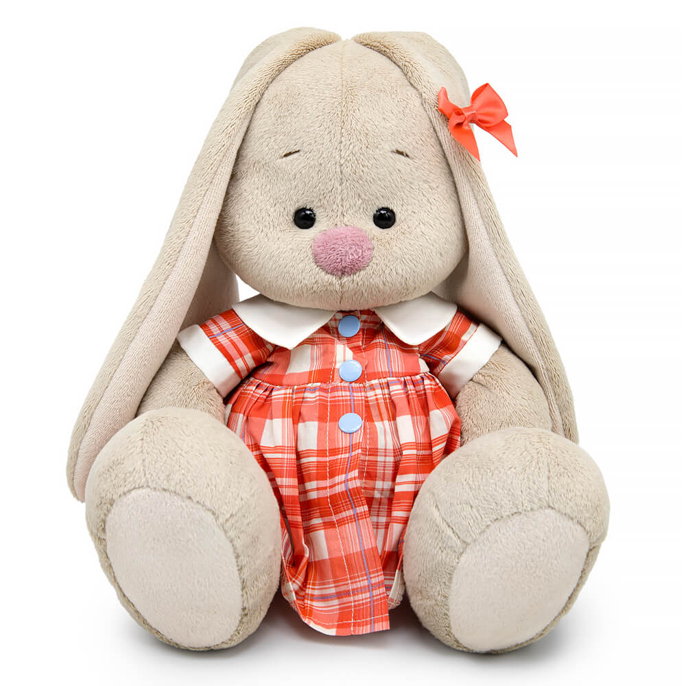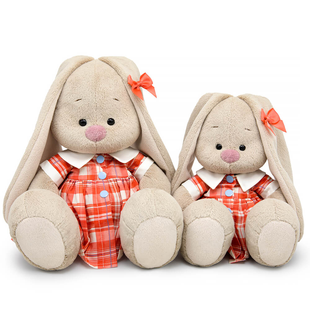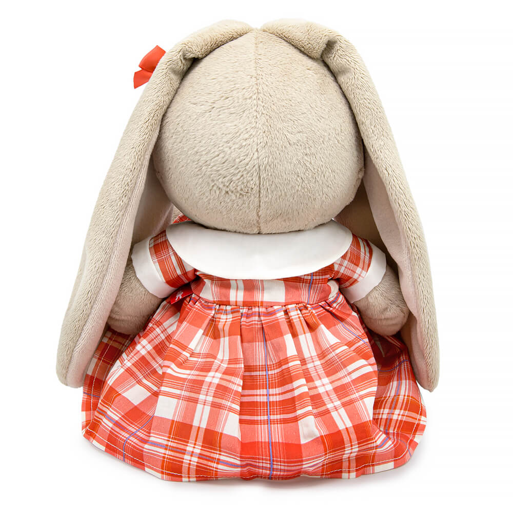 Классное платье в модную клетку сшито отрезным по талии, с коротким рукавом с манжетом и отложным воротником молочного цвета. Спереди платье застегивается на нежно-голубые кнопки. На ушке у Зайки Ми бантик красного теплого оттенка.