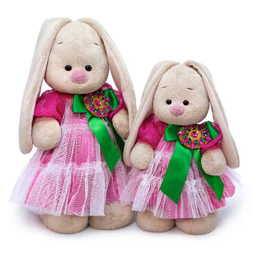 Зайка Ми в нарядном платье, сшитом из нескольких тканей. Маджентового сатина снизу и воланами из белоснежной сеточки сверху, рукава фонарики из двойной сеточки цвета сочной малины. Платье украшено шикарной брошью ручной работы на атласной широкой ленте.